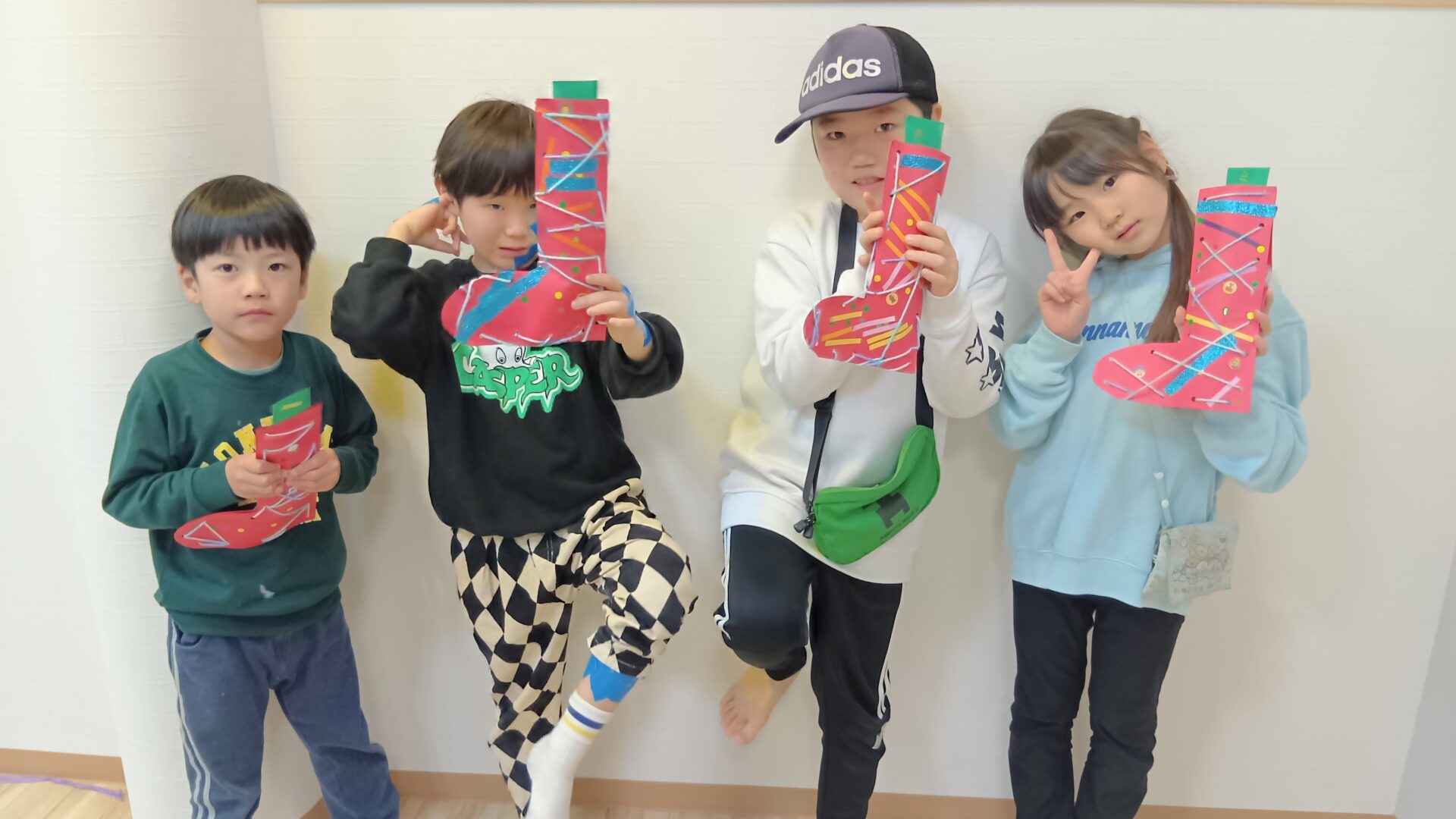 自由にシールやテープ、毛糸を巻いて、おしゃれにして。世界でたったひとつのオリジナルのクリスマスブーツができあがりました♪サンタさんへの手紙をまだ書いていない子たちは、ほしいものを紙にかいて、そのブーツに入れて。ワクワクした気持ちも胸に、ハイポーズ♪