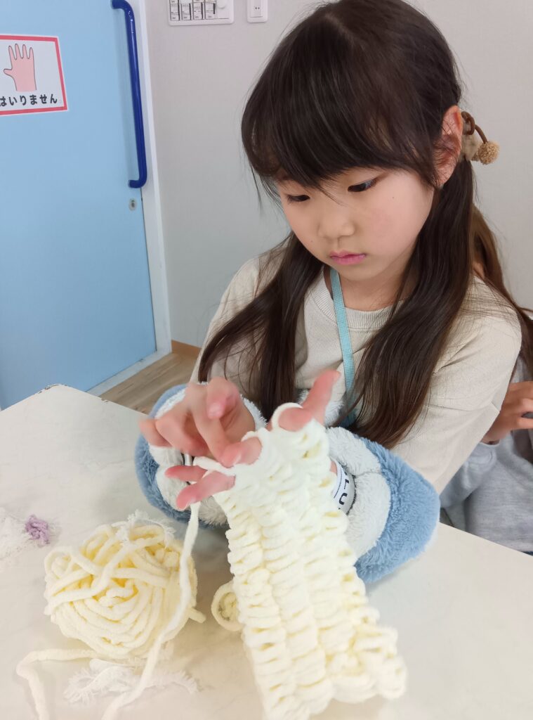 あみものをしながらおしゃべりをしていると、「あ!先生としゃべってたせいで、わからんくなったやん!今からしゃべらんとって。」と、ちょっぴりしょんぼりな場面もありましたが(笑)