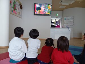 クリスマスイブということもあって、おやつ前のひと休みに、久しぶりにDVDタイム。みんなで「ミッキーのクリスマス」を観ました。