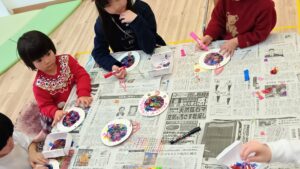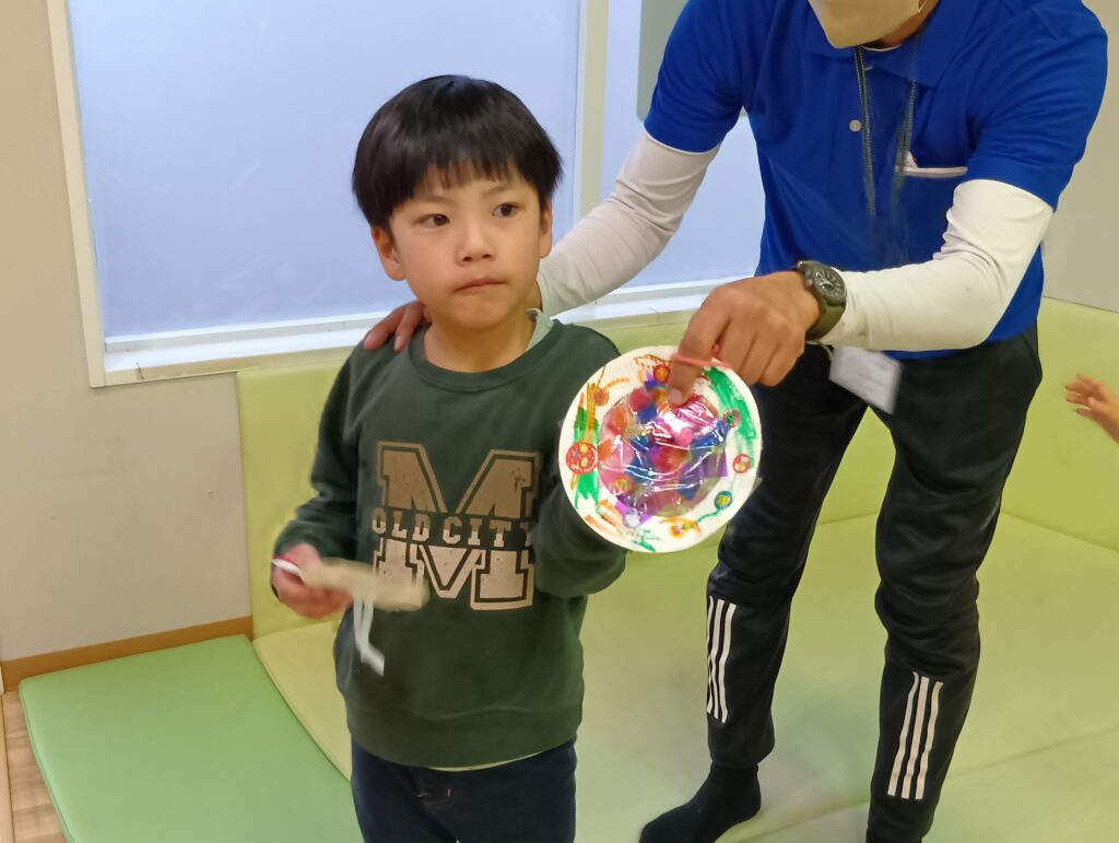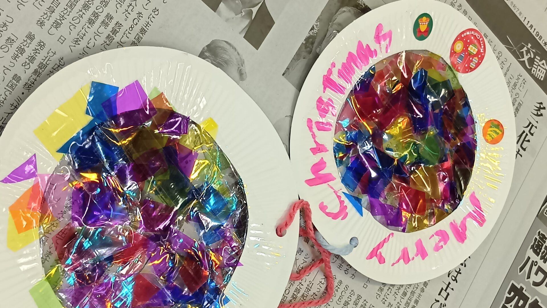 紙皿にカラフルなフィルムを貼っていくと、光に透けてキラキラ。ひとりひとり違う色合いの、すてきな作品ができあがりました。