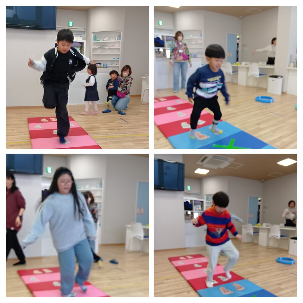 木曜日は、みんなでサーキット。マットの上の足型マークに合わせて、体を動かしました。
