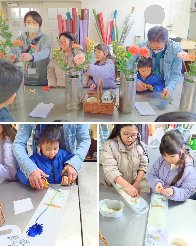 土曜日は、花屋さんで花束作り体験をしました。お花屋さんの店内を案内してもらったあと、それぞれ好きなお花を選びます。茎の先を切って水を吸いやすくしたり、ラッピングをしたりして、すてきな花束ができあがりました。