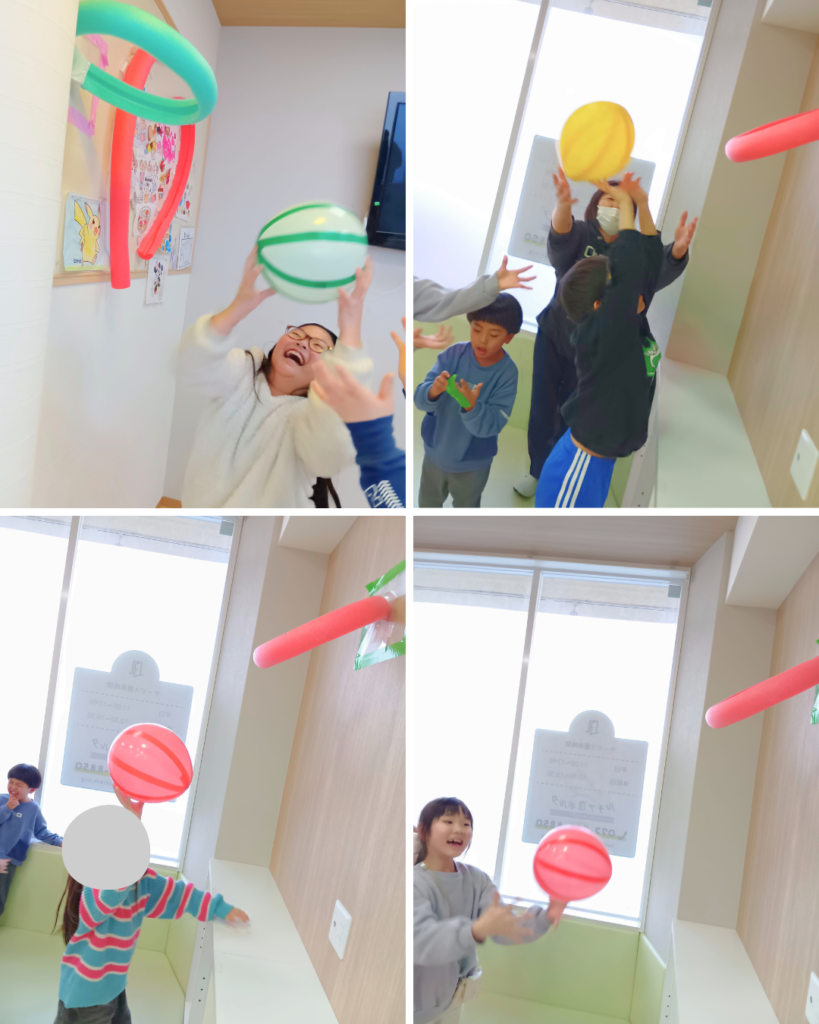 木曜日は、風船バスケットボールをしました♪プールスティックを丸めてゴールを作り、風船を入れて楽しむバスケットボールです。3チームに分かれて、「何回入れられるかな?」と挑戦。みんな笑顔で、にぎやかな時間になりました。