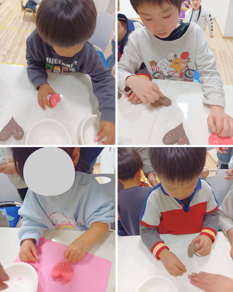全員がそろってからは、バレンタインのプレゼント作り。茶色とピンクのねんどから好きな色を選び、ハートを作って、好きなビーズを埋め込みました。どれも、その子らしいやさしい作品に仕上がりました。