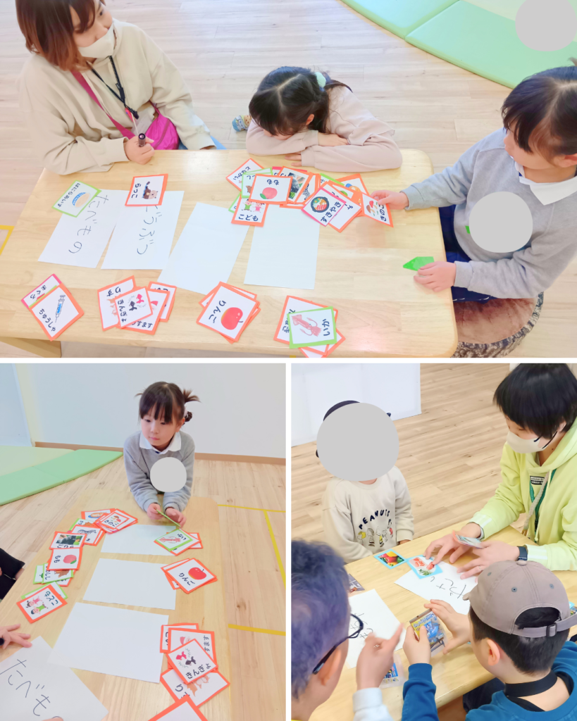 金曜日は、分類分けゲームをしました。2つのグループに分かれ、いろいろなものが描かれたカードを見ながら、「これは何に分類できるかな?」と話し合います。やさい、しぜん、たべもの、どうぶつ、おもちゃ・・・と、さまざまな意見が出てきて、同じカードでもいろいろな分け方があることに気づく時間になりました。話し合いながら、楽しく考えることができました。