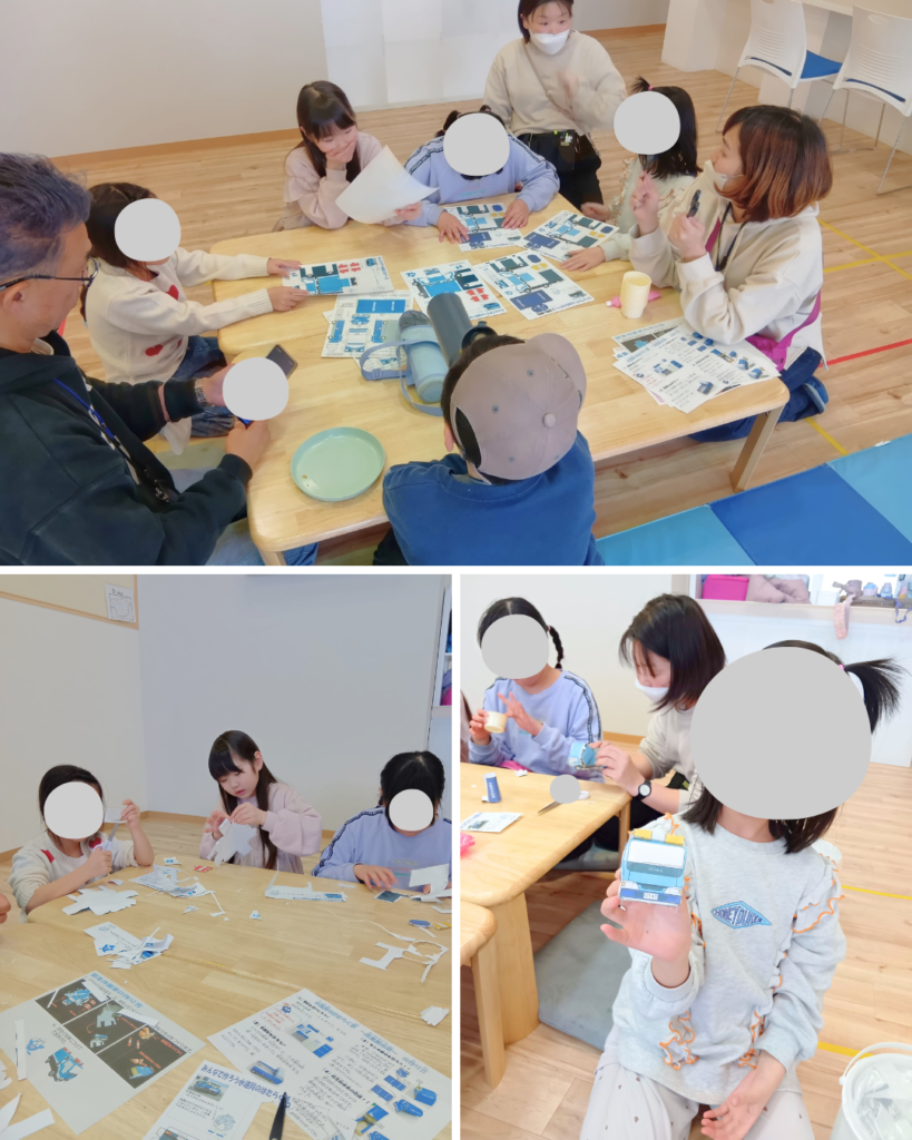 帰ってきてからは、水道局でいただいた制作キットに挑戦。ハサミで切って、のりで貼り合わせると、乗り物が完成します。それぞれが工夫しながら、楽しそうに取り組んでいました。