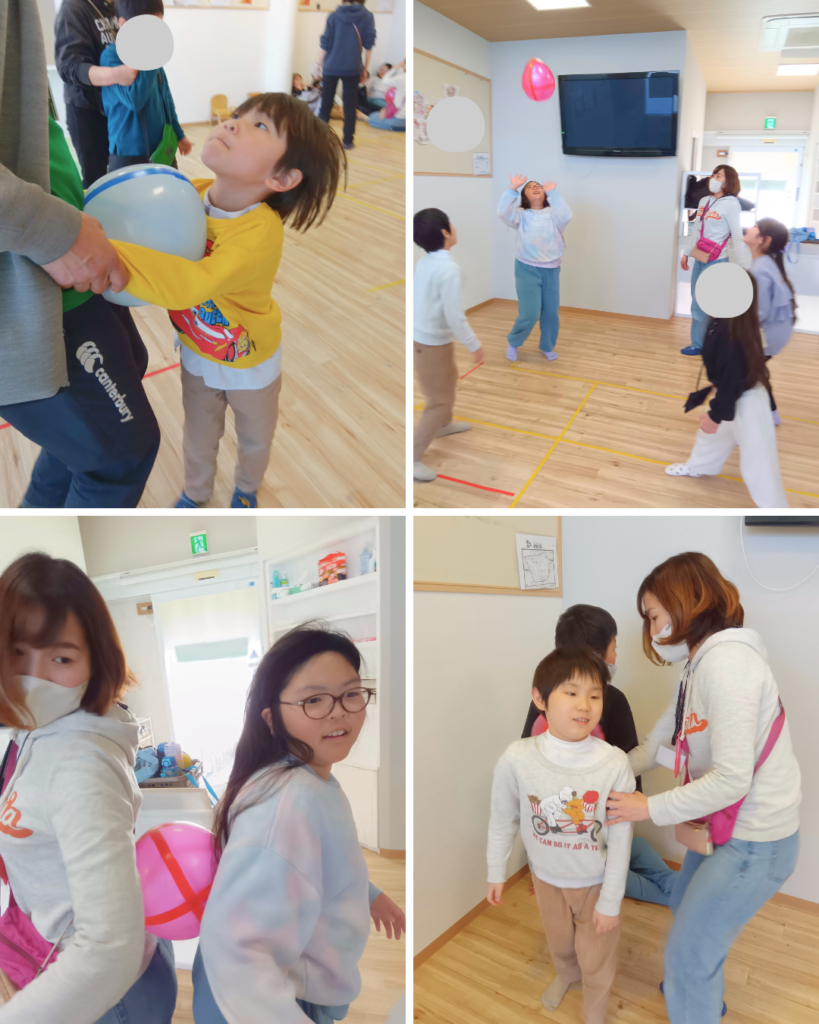 木曜日は、風船あそびをしました。みんなで円になって風船をパスし合ったり、背中同士で風船をはさんで落とさないように歩いたりして、体を動かしました。「落ちる〜!」「ゆっくりゆっくり!」と声をかけ合いながら、友だちと協力して楽しむ姿も見られました。シンプルな遊びですが、体を動かしながら自然と笑顔が増える時間になりました。