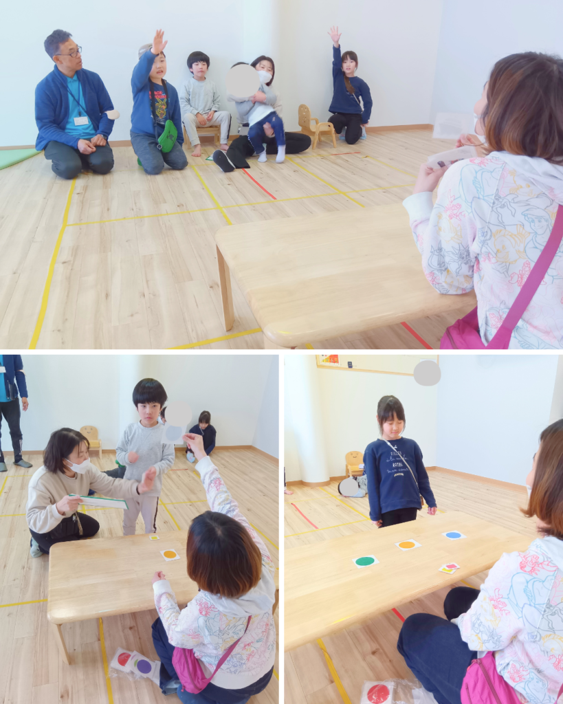 水曜日は、「カードを覚えよう♪」のゲームをしました。先生がまずカードを3枚並べて見せます。みんなでよく見て覚えたら、いったん目を閉じて・・・。そのあいだに先生がカードの位置を入れ替えます。目を開けて、「どこが変わったかな?」とみんなで考えました。「ここが動いてる!」「さっきはこっちやった!」と、よく思い出しながら答えてくれる子どもたち。シンプルなゲームですが、よく見て覚える力や、変化に気づく力を使うあそびでした。