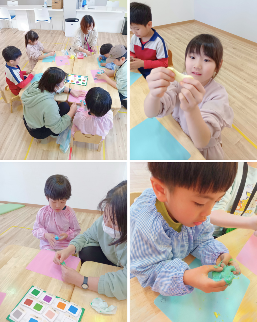 火曜日は、スライムで色づくりを楽しみました。「水色とピンクを混ぜたら、何色になるかな?」とクイズを出して、みんなで考えたり予想したり。「この色は、何色と何色を混ぜたらできるかな?」と、自分の好きな色を思い浮かべながら実際に混ぜて確かめてみたり。スライムのやわらかい感触を手で味わいながら、色が変わっていく様子を楽しみました。