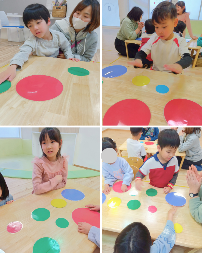 先生が「赤・黄色・みどり!」などと伝えると、その順番通りにカードをタッチしていきます。最初はシンプルな色の組み合わせからスタートし、少しずつ数を増やしてレベルアップ。楽しみながら取り組む中で、自然と記憶力や集中力を育てることができました。。
