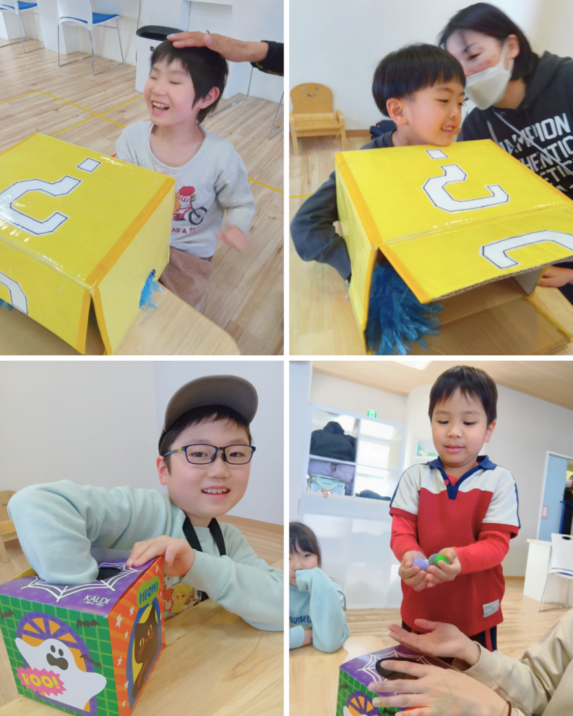 火曜日は、「何個入っているかな?」ゲームを楽しみました。ハテナボックスの中にはボールが入っていて、中は見えません。手の感覚だけを頼りに、いくつ入っているかを数えていきます。ドキドキしながら手を入れて、「これくらいかな?」と考えて。感覚を使いながら、数への意識も育てることができました。