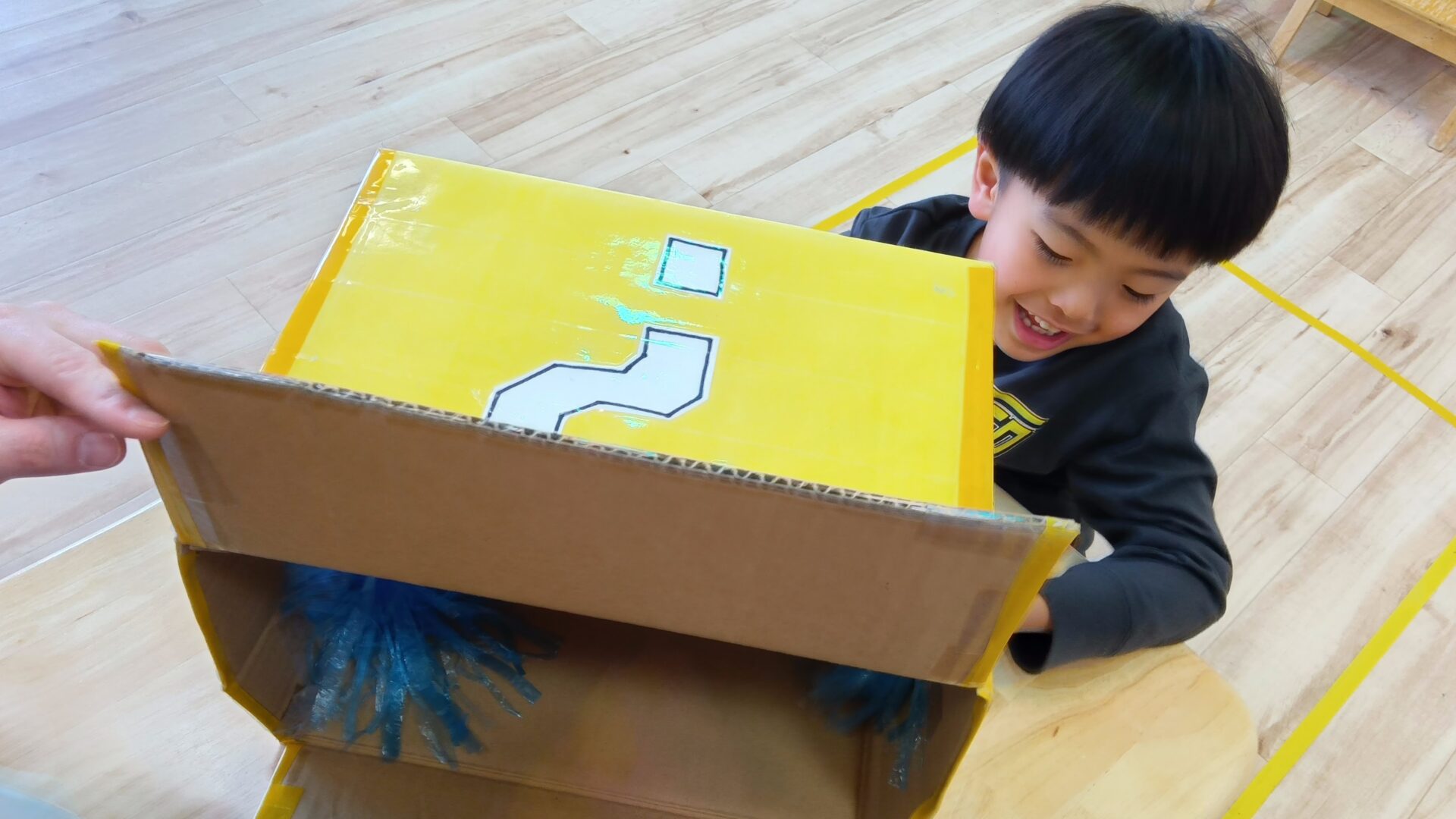 火曜日は、「何個入っているかな?」ゲームを楽しみました。ハテナボックスの中にはボールが入っていて、中は見えません。手の感覚だけを頼りに、いくつ入っているかを数えていきます。ドキドキしながら手を入れて、「これくらいかな?」と考えて。感覚を使いながら、数への意識も育てることができました。