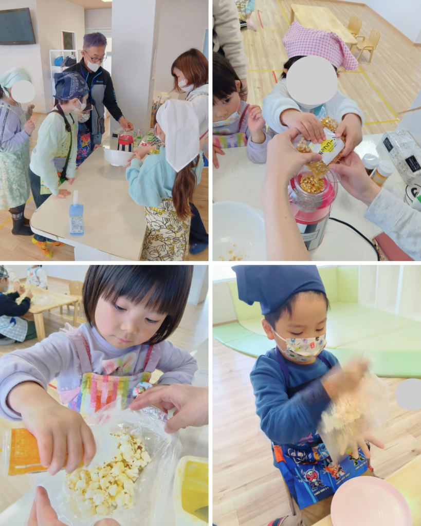 先生のひとりが、ポップコーンが作れる機械を持ってきてくれて、みんなでワクワクしながらスタート。ポップコーンのもと(コーン)が「ポンッ!ポンッ!」とはじけて、ふわっとポップコーンになる様子に、「すごーい!」と目をキラキラさせる子どもたち。
